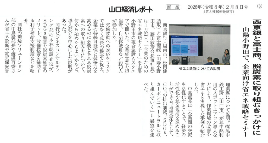 富士商株式会社 環境ソリューション部は、西京銀行との共催による「企業のための省エネ戦略セミナー」を実施し、2026年(令和8年)2月8日号の「山口経済レポート」に掲載されました。