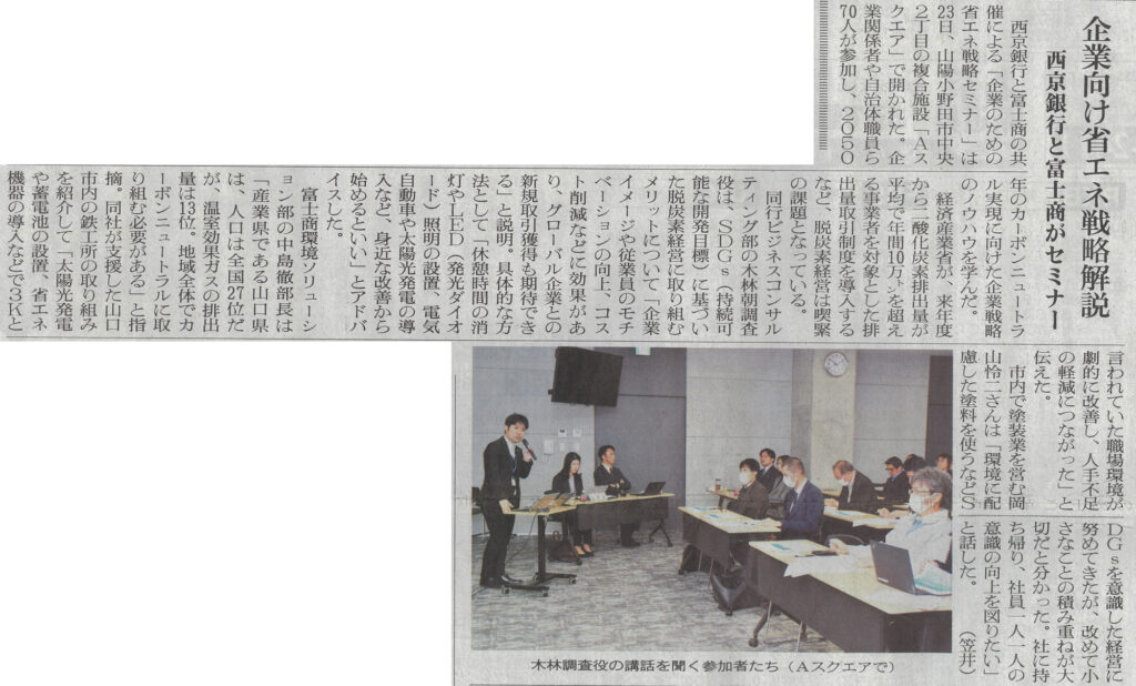 News お知らせ 2026年1月27日 西京銀行×富士商株式会社による共催【企業のための省エネ戦略セミナー】実施について、宇部日報(1/26)に掲載されました。 富士商株式会社 環境ソリューション部は、西京銀行との共催による「企業のための省エネ戦略セミナー」を実施し、2026年(令和8年)1月26日号の「宇部日報」に掲載されました。 TOP お知らせ